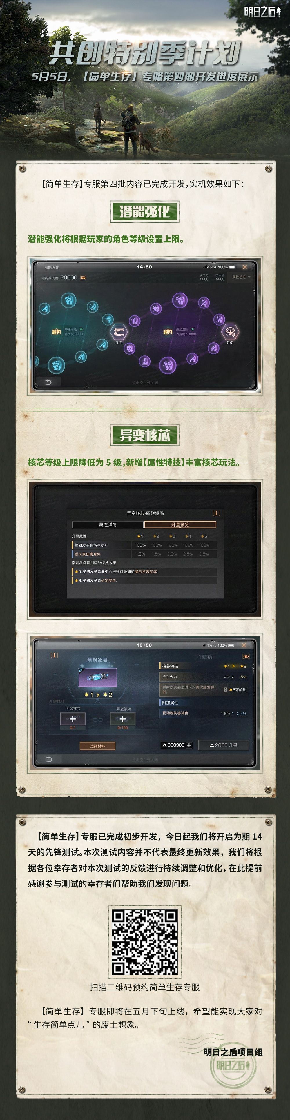 【简单生存】专服确认的内容中,【潜能强化】、【异变核芯】的调整优化已完成,具体的实机效果可查看下图。