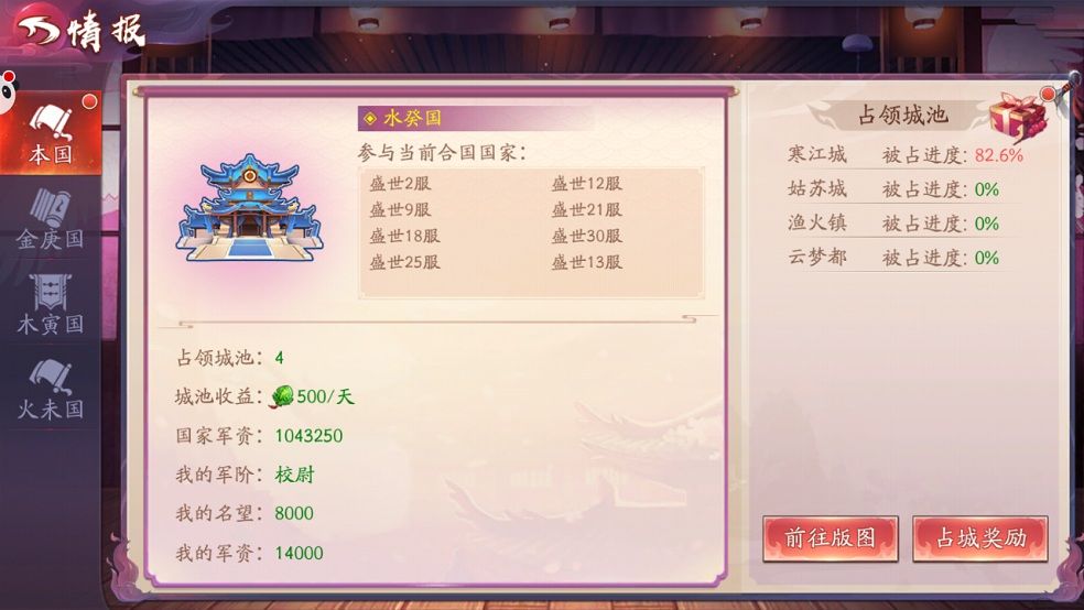 情报信息包括参与合国的服务器、占领城池数量、占领城池进度、城池收益、国家军资。降妖师在本国界面还可查看自己的军阶、名望、军资。