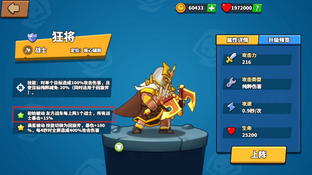 2、其次上狂将增加整体战士的暴击伤害,进一步提高爆发性伤害
