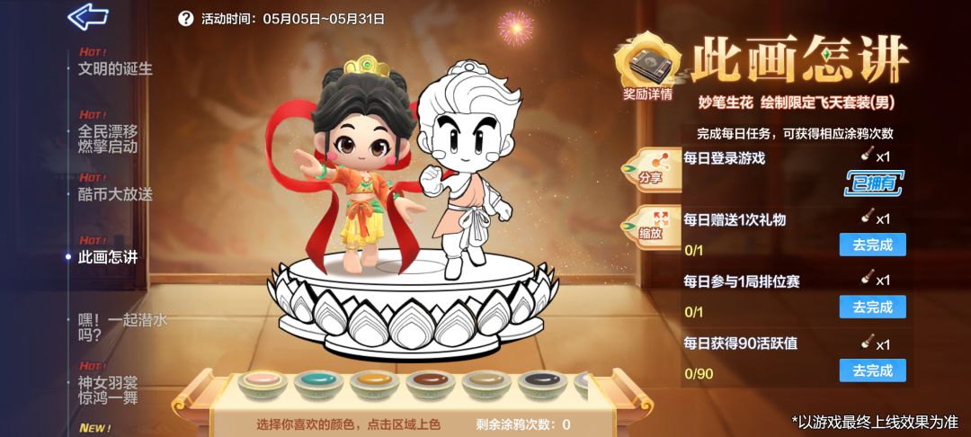 书中自有黄金屋,那画中有什么?飞天华裳,此画怎讲?5月5日起,【此画怎讲】活动开启,车友们完成指定任务即可获得涂鸦画笔,用它就能绘制你的限定飞天套装(男)~