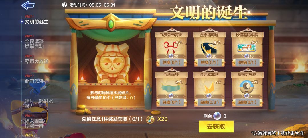 金黄的沙漠内流传着古老的传说,丰饶的物资,缠绵的流水孕育出别样的文明,多少故事于此诞生~5月5日起,全新活动【文明的诞生】开启,每日参与对局即可获得【水滴碎片】。
