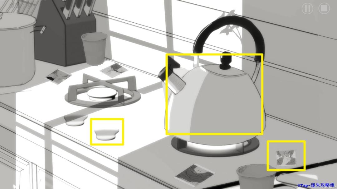 5.点击右下角的照片,收集照片后点击炉子的按钮将火灭掉。灭掉火后点击沸腾的水壶。(注意纸鹤、信封、马克笔、牛奶及照片会随机出现在该场景及其前后场景中)