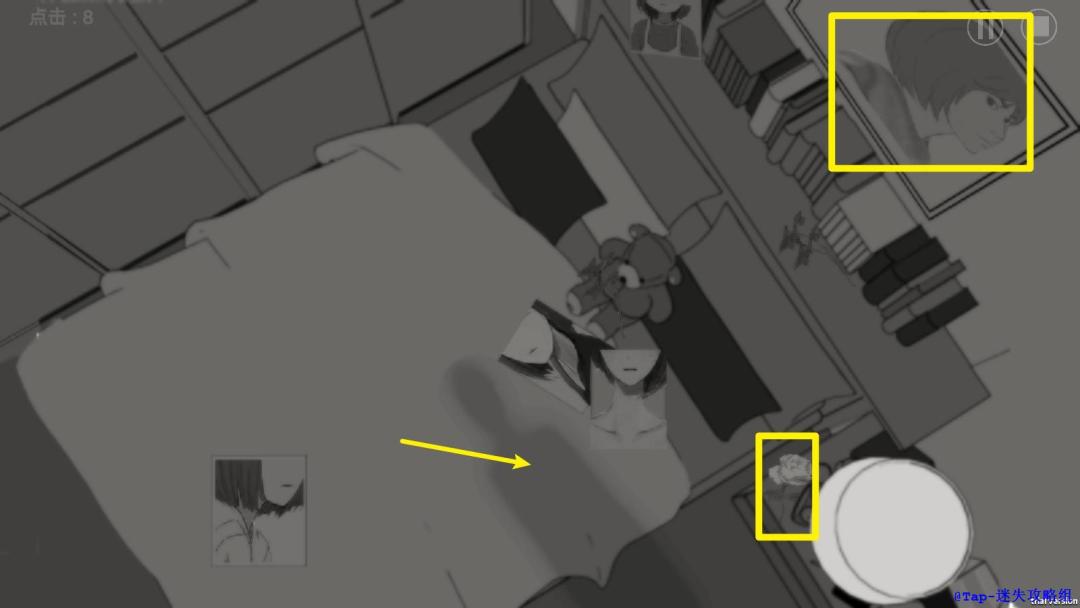3.点击床头柜上的小花,点击右上角画框中的照片将其收集,注意花和照片的位置是随机的。收集这两个物品后,点击床上的人影。