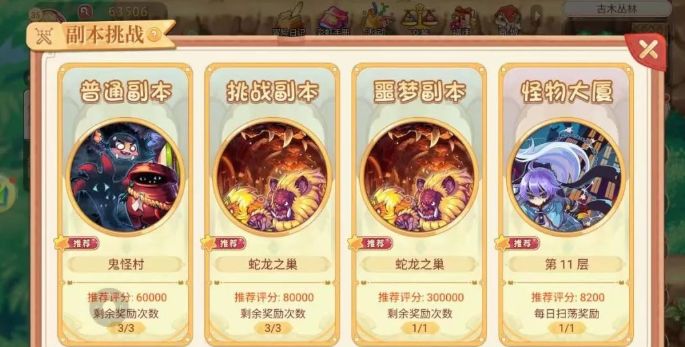 副本分为普通、挑战、噩梦三个阶段,每天的奖励次数都是有限制的,普通和挑战的每天都有三次奖励,而噩梦难度的只有一次奖励,难度也是最大的。每个副本都有推荐评分,家人们可以根据自己的评分去挑战副本,和好友组队或者在世界聊天找队友可以更轻松的通关副本,觉得麻烦的岛民也可以自动匹配。