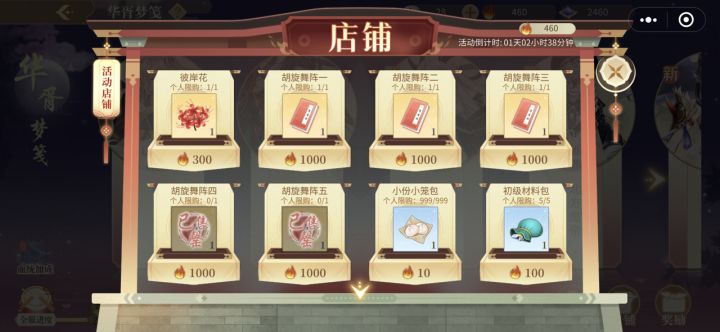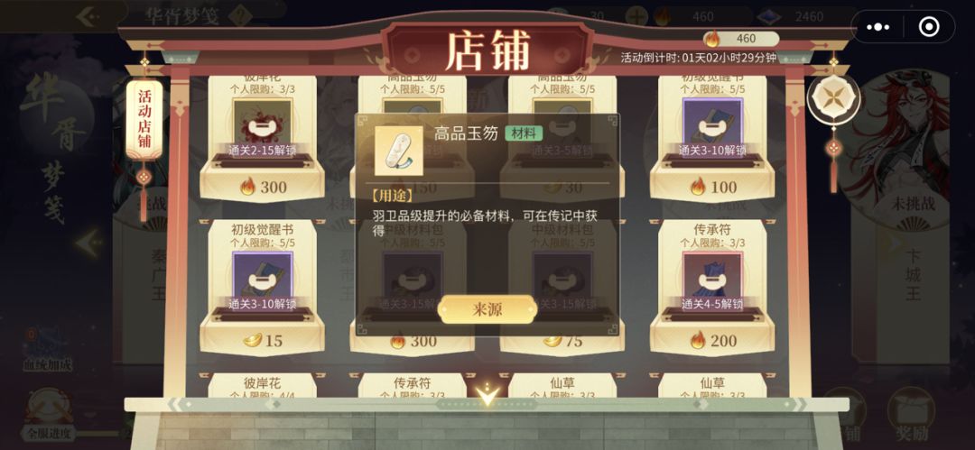 通关活动关卡获得小火苗(情绪余烬),到活动商店兑换《胡旋舞阵》和高品玉笏。