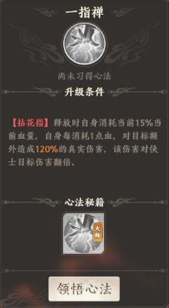 释放拈花指时,消耗自身百分之15%的血量,自身每消耗一点血,就对目标额外造成120%的真实伤害,该伤害对侠士目标伤害翻倍。