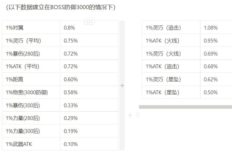 1%武器ATK=1%武器基础ATK×(1+ATK%)×(1-物理抗性)=230×0.01×1.82×0.93=3.9有效ATK。