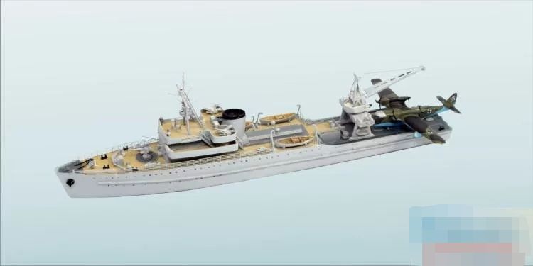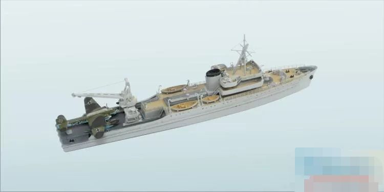 二战德国海军水上飞机母舰里希特霍芬号(红男爵号?)(1943年状态)搭载亨克尔He-115水上轰炸机/鱼雷攻击机×1架,道尼尔Do-26水上侦察/轰炸机×1架
