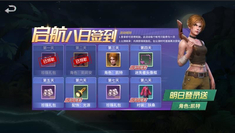 1、 启航八日签到:本次测试创建的新角色进入游戏后,每天登录游戏,即可领取当日奖励。如在本次测试中获得:启航头像框、启航配饰:光源、启航时装:扶桑,正式上线后可继承;