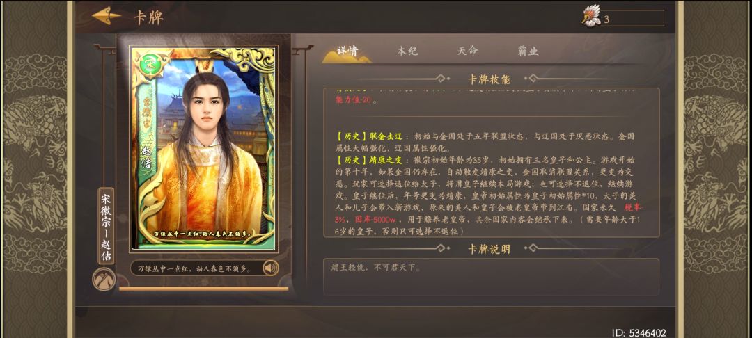 对比一下传位前的属性,确认是不是传给岳飞了(因为虽然礼部可以立养子为太子,但实际上读档重来,再去东宫会提示未立太子,在后话中也是显示你未立太子,所以养子太子这里有bug)