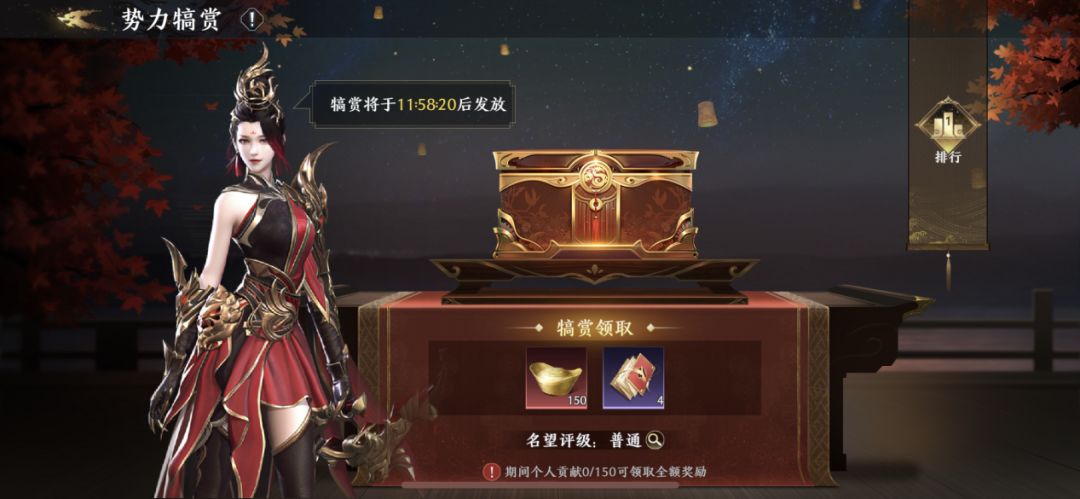 获得势力犒赏的门槛很低,将军在结算周期内累计指定的势力贡献,就能在犒赏结算时领取全额的犒赏,即使势力贡献不足也可以领取部分势力犒赏。除此之外,名门望族势力的任职人员,还能根据势力周期内的累积活跃获取额外的活跃犒赏。