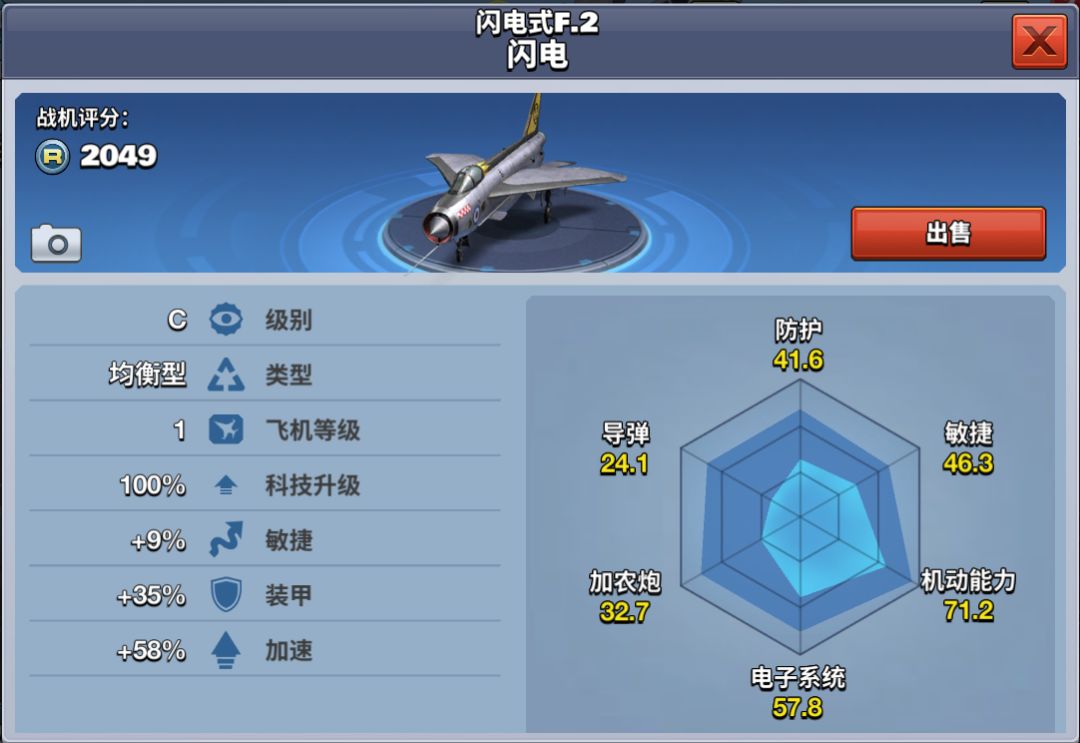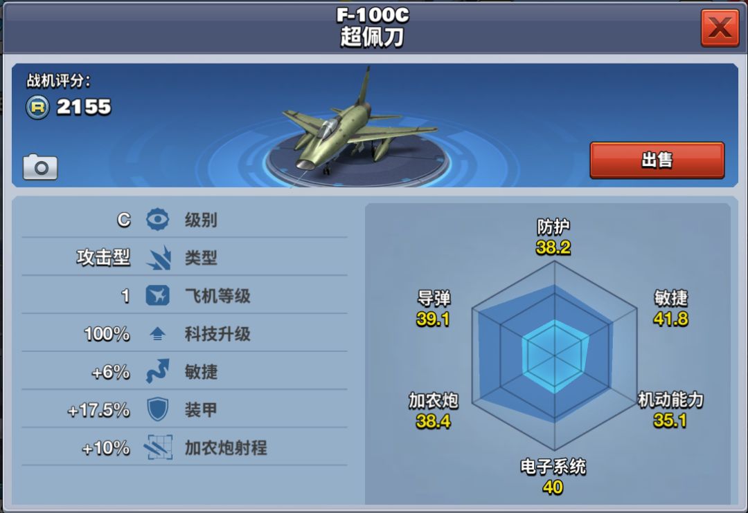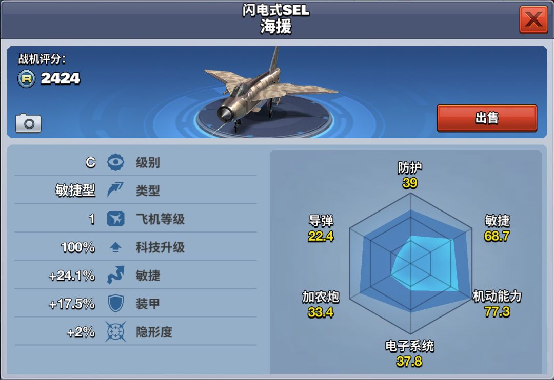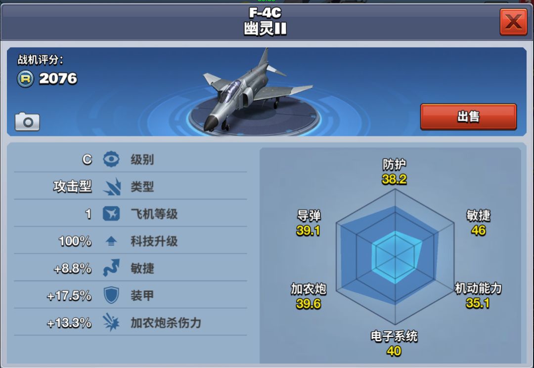 该架飞机属于C级攻击型飞机,在同级别飞机中,其电子干扰能力最强,加农炮杀伤力有一定的优势。5级解锁,在商店中推送购买,需花费32000金币。