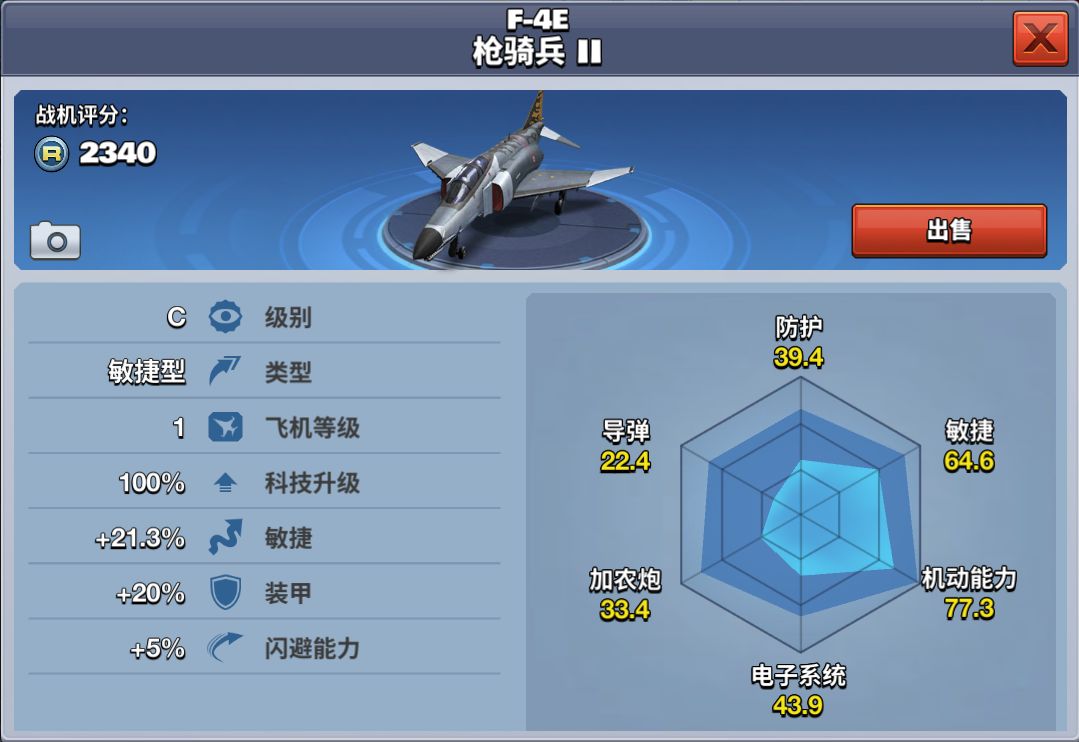 F-4E枪骑兵II属于C级敏捷型飞机。勋章达到160即可解锁,商店中推送购买需花费9600金币。其敏捷性能较好,能有效减慢敌方导弹锁定速度。
