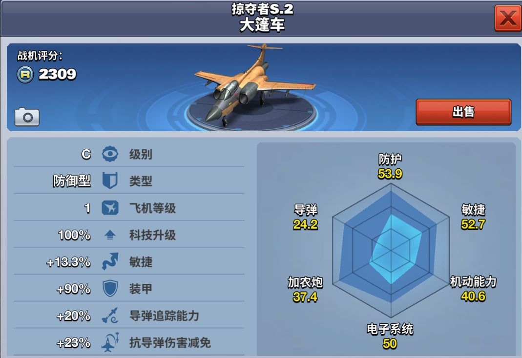 该架飞机800勋章解锁,只需680钻石即可获得。掠夺者S.2大篷车作为一款防御型飞机,拥有同级别飞机中最厚实的装甲,良好的导弹追踪性能,十分抗揍。非常适合新手玩家前期攻打地图小关卡。