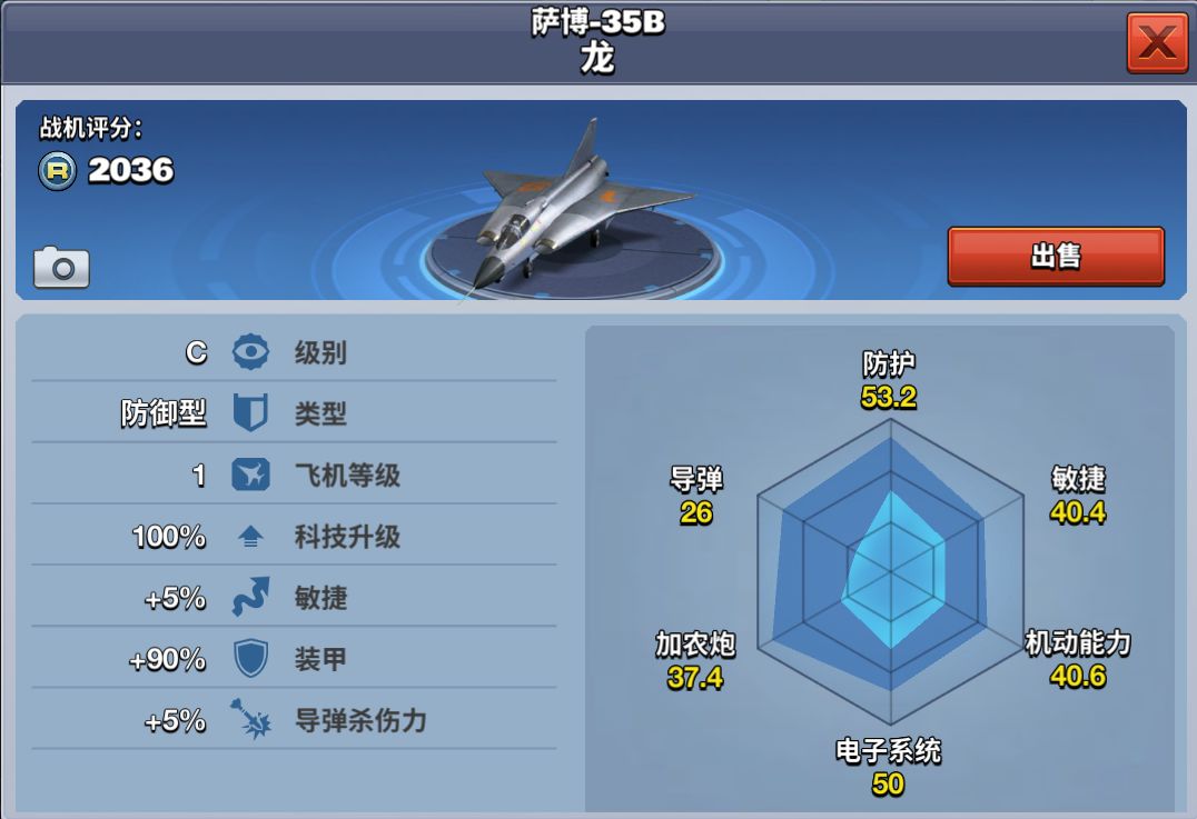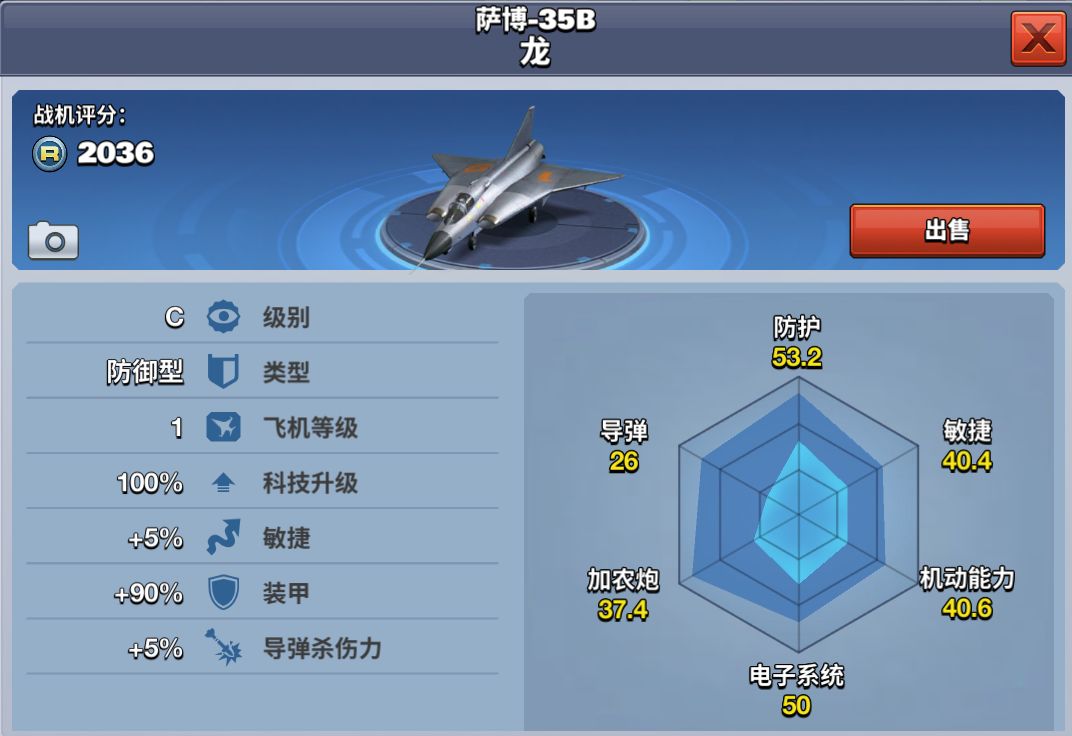 萨博-35B龙在《空战争锋》游戏中,是一款装甲非常厚的且导弹杀伤力超强的C级防御型飞机。它可用来攻打前期小地图关卡,是C级飞机中的肉盾。6级解锁,花费10000金币即可收入囊中,也可花费300钻石提前解锁。