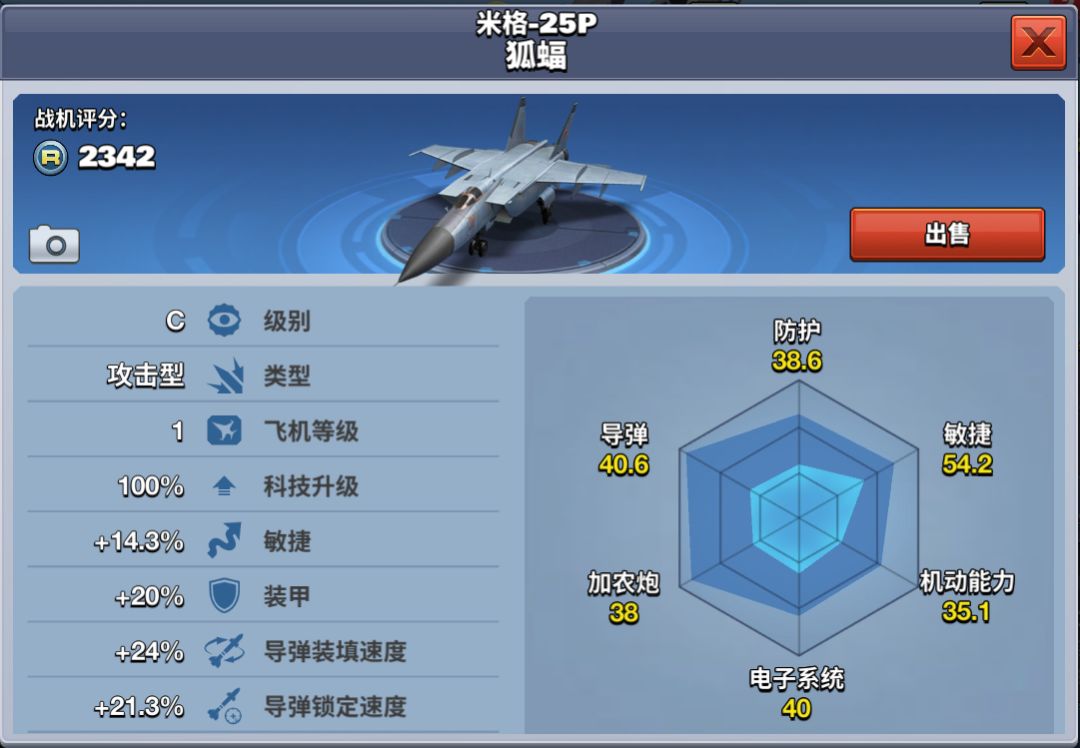 米格-25P狐蝙是C级2V2神器,属于攻击型飞机。其敏捷性能较好,灵活,装甲适中,导弹锁定速度够快。18级解锁该架飞机,需要花费45000金币获得,提前获得需要花费1350钻石,是萌萌新的首选。