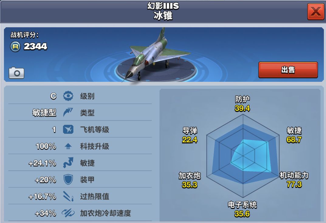 幻影IIIS冰锥是一架C级敏捷型飞机,其灵活性好,各个属性适中,非常适合近距离缠斗,是未来C级1V1王者。达到600勋章解锁,花费620钻石在商店购买。