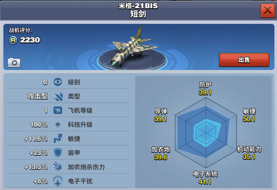 在《空战争锋》游戏内,属于C级敏捷型飞机。米格-21F哨兵作为一架基础机,只要注册游戏后进入游戏,就可以免费获得。通过这架基础战斗机开启空战之旅。