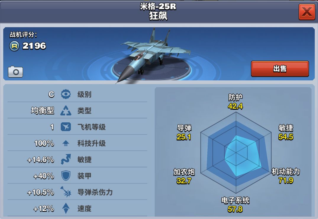 该架飞机属于C级均衡型飞机,9级解锁,商店中推送,购买需要花费68000金币。米格-25R狂飙拥有较好的装甲,够快的飞行速度,适合速度控的新手玩家。