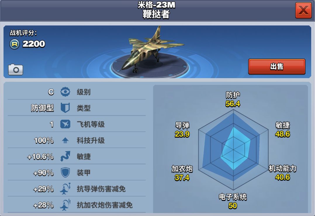 米格-23M 鞭挞者在游戏中是一架C级防御型战机,在大家前期选择不是很多的情况下,选择米格-23M 鞭挞者是一个性价比较高的选择。11级解锁,92000金币购买。