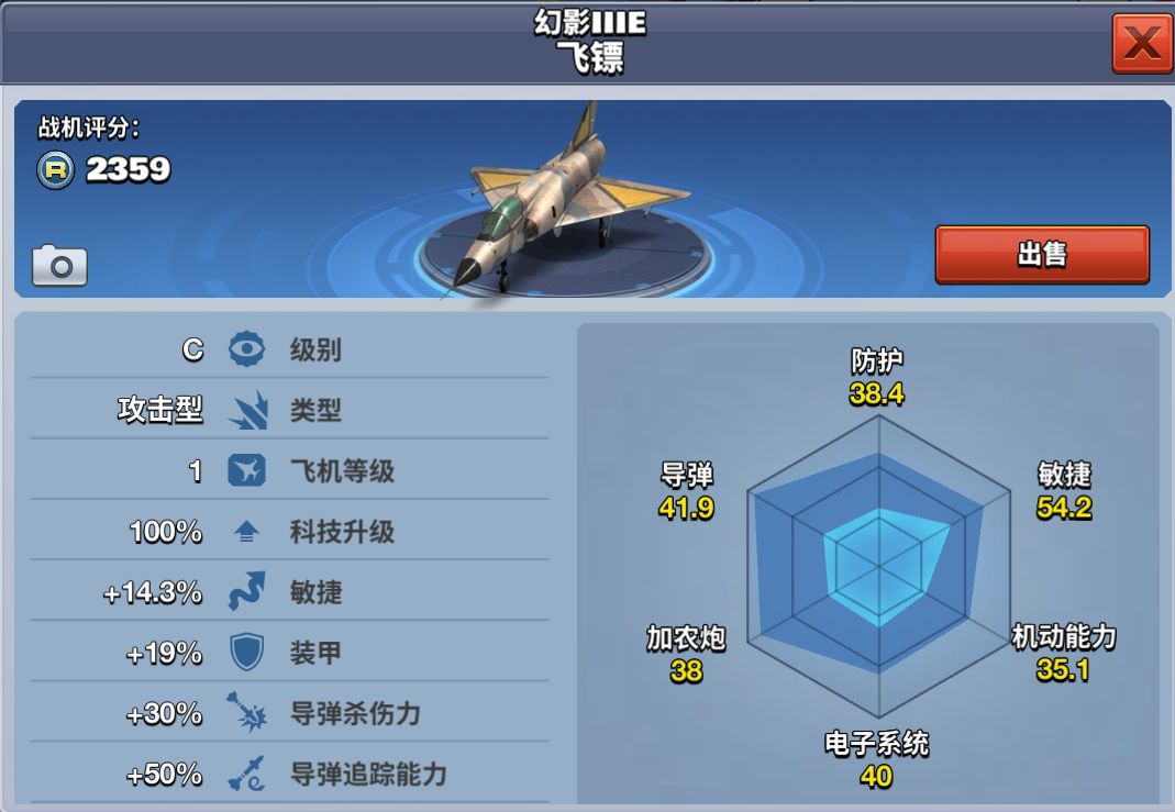 幻影IIIE是一架C级攻击型飞机,达到400勋章解锁,需要花费560钻石购买。其导弹杀伤力属于同级别飞机中最强者,适合导弹控的新手玩家。