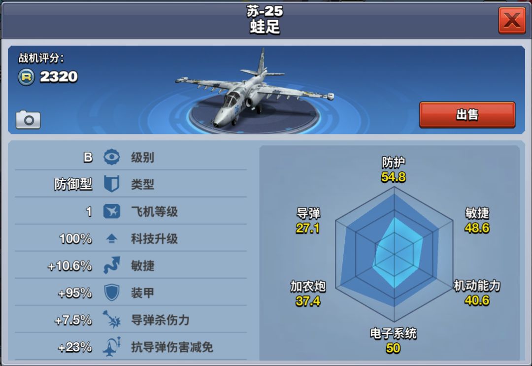 苏-25 蛙足在游戏中是一架B级防御型飞机,在游戏内通过次日签到获取。