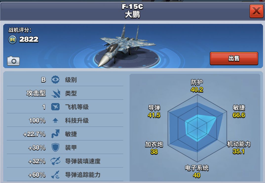 F-15鹰在24级解锁,需要花费1100钻石购买。其各个属性均衡,非常好的额外加成属性,是一款处于B级上等位置的均衡型飞机。