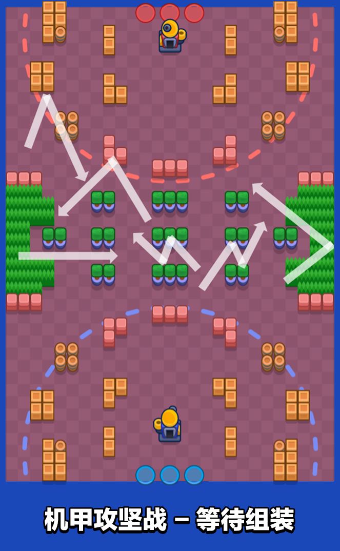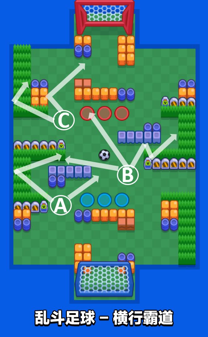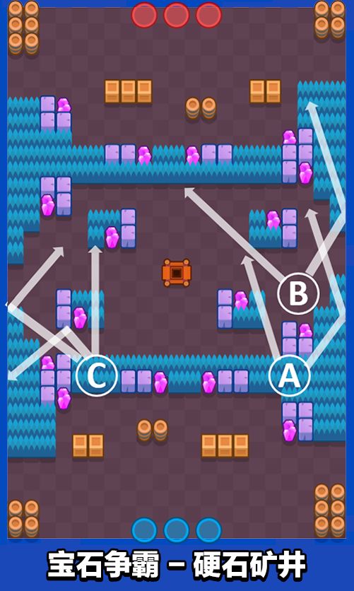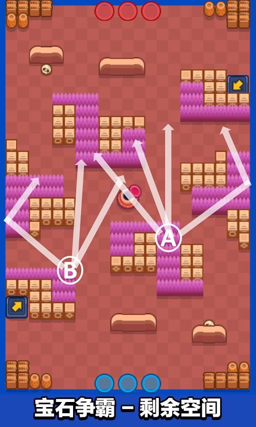 开局在到达A点后,两种选择,一是直接向正前方攻击探草,二是攻击右边墙体,反弹去探敌方右边靠墙的草丛。取得优势后,来到B点,进一步压制,多走位,打输出,压制地方,差不多就可以控制这张地图的右上部分。