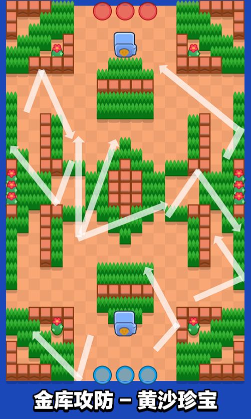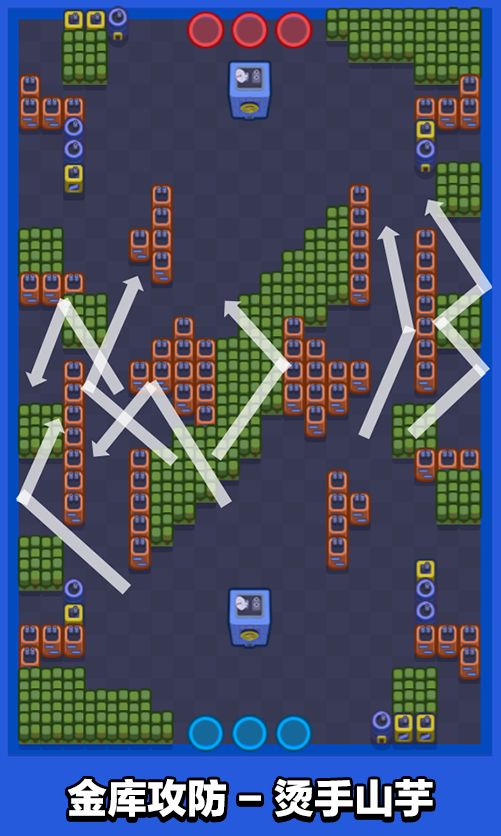 反弹点位已标出,瑞科可掩护短手或者很难独自前压的队友(公牛、爆破麦克、巴利)上前,防守即不要让敌方碰到金库,特别注意有大招的妮塔、杰西、潘妮,还有斯派克及柯尔特。