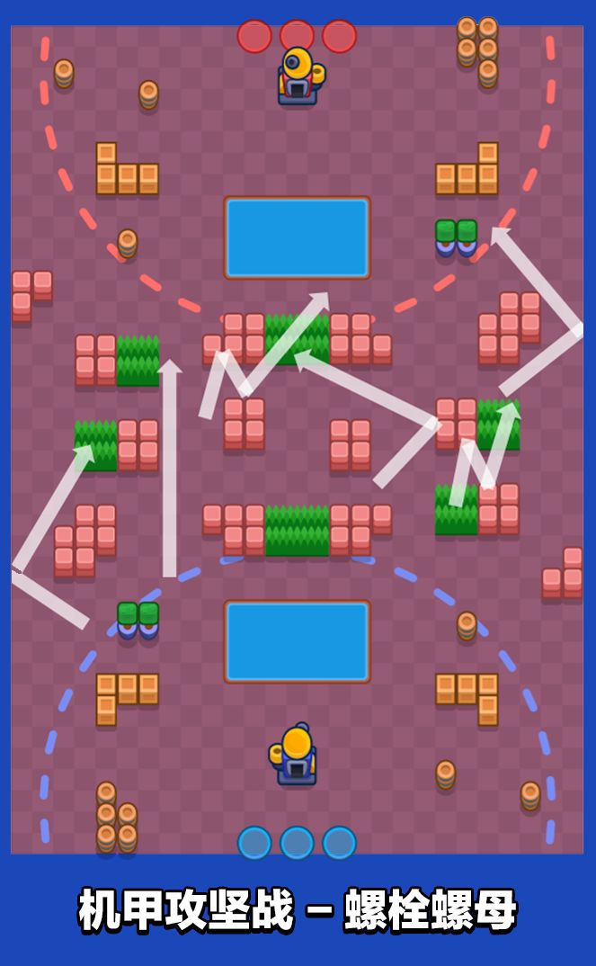 这两张地图,建议玩双人荒野决斗,可搭配使用阿渤(一星徽)、迪克、芽芽等,由外向内,在外圈搞事情,把敌方统统赶到中间草丛或空地,坐享渔翁之利。