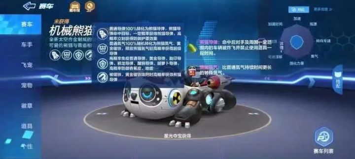 机械熊猫是2023年4月29日S24赛季通过星光夺宝获得的一辆传说道具车。是一辆辅助上位车,熊猫导弹和破坏光线类似,小范围攻击同时锁道具4秒,缺点是敌我不分,获取方式是通过道具箱,命中目标及被双磁铁吸附概率获得,防御方面可以高概率防御多达6种导弹,2种地面道具以及熊猫导弹命中目标高概率获得防御护罩效果。机械熊猫可以看成是加强版的机械三角龙,被动防御技能很多,除此之外防御护罩及黄金磁铁也有一定的防御能力,尤其是防御护罩可以通过不断命中目标层层叠加,组队道具赛中最理想的情况是队友领跑,机械熊猫占据二位不断攻击后方对手从而使队友越跑越远,自己也能获得不少防御护罩抵抗对手的攻击。个人道具赛一般扛不住狂轰滥炸,可以最后用磁铁偷鸡获得理想的排名。总的来说,机械熊猫是一辆在组队赛中比较不错的辅助道具车,适合喜欢攻击辅助队友的玩家。