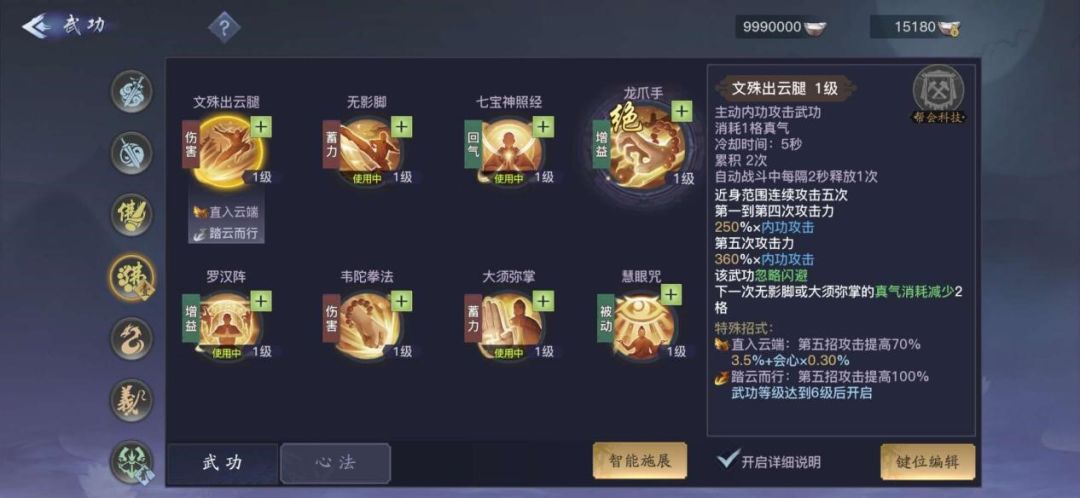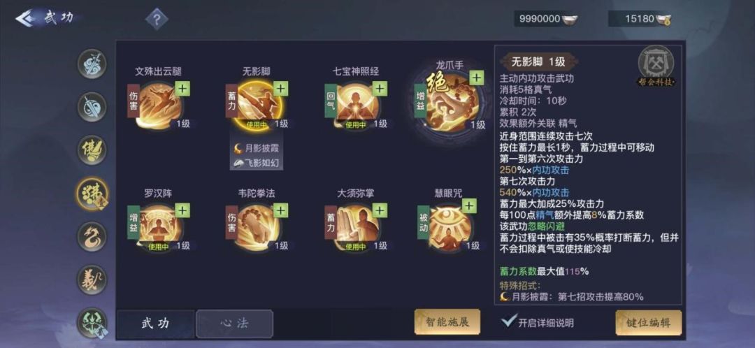 NO1:龙爪手,少林著名绝学,武魂招牌大招技能。最大的优点是可以累积2次使用次数,这一点在所有门派流派中非常罕见。龙抓手施展时可以造成一次范围型的高伤害,并且会增加一个BUFF效果,所有攻击附带65%概率使目标2秒减少移动速度,35%概率封轻功1秒,攻击忽略闪避值提高,攻击忽略内功防御提高,BUFF持续时间是8秒,特殊招式还会增加2-3秒。这是一个高伤害,附带控制,增加超多BUFF的强力技能,武魂的绝对核心技能,所以加点优先级排在第一位,毫无争议。