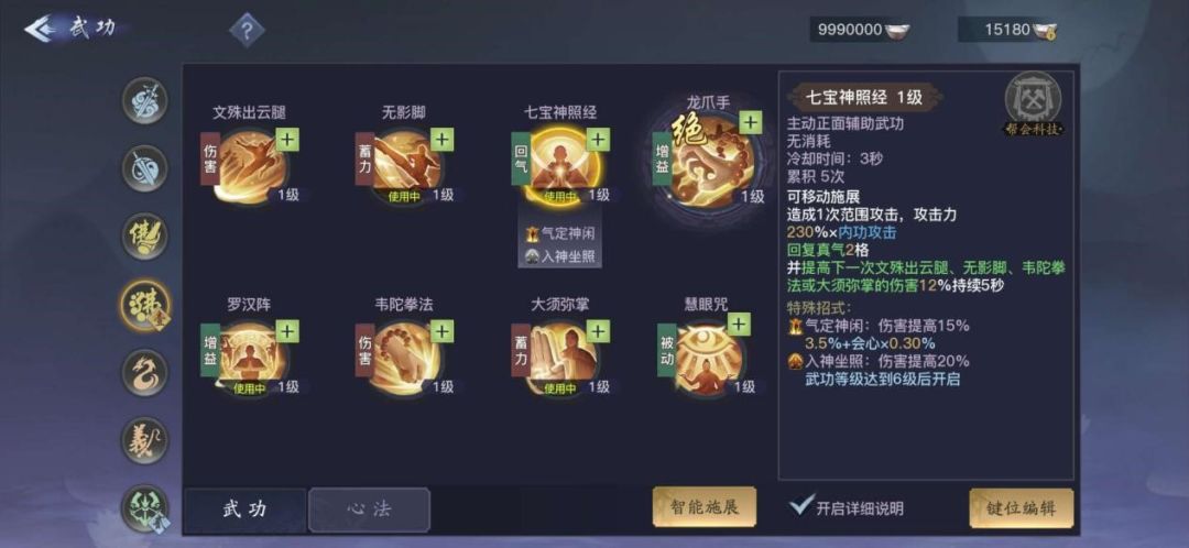 NO4:七宝神照经,辅助技能,主要作用是回复真气,并且提高一下次四种伤害技能的伤害值,持续5秒,特殊招式会增加百分比伤害。武魂的技能释放都是需要消耗真气的,而七宝神照经是最主要的回复真气技能,并且能提升很多技能的伤害,作用十分重要。还有一个优点就是释放时可以造成一次范围伤害,伤害不高,技能可以最多累积5次使用次数,冷却时间很多只有3秒,七宝神照经对于武魂流派来说非常的重要,技能优先级排在第四位。