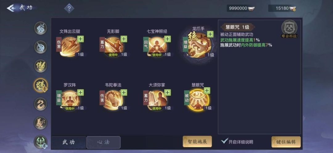 NO2:慧眼咒,被动技能,增加武功施展速度并在施展武功时提高内外功防御,既是增加技能释放速度的攻击型被动技能,还能增加防御。技能效果非常突出,对于武魂流派角色有很大的提升,加点优先级排在第二位。