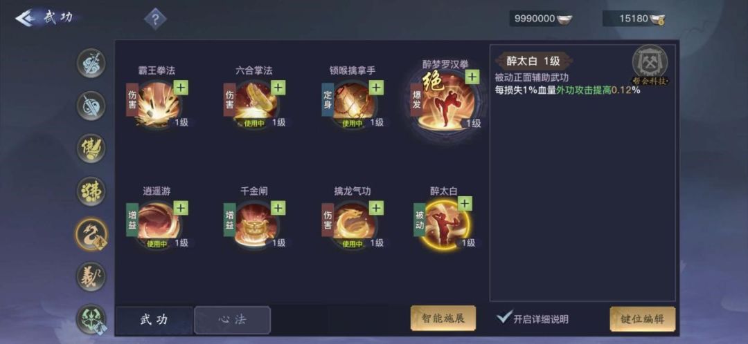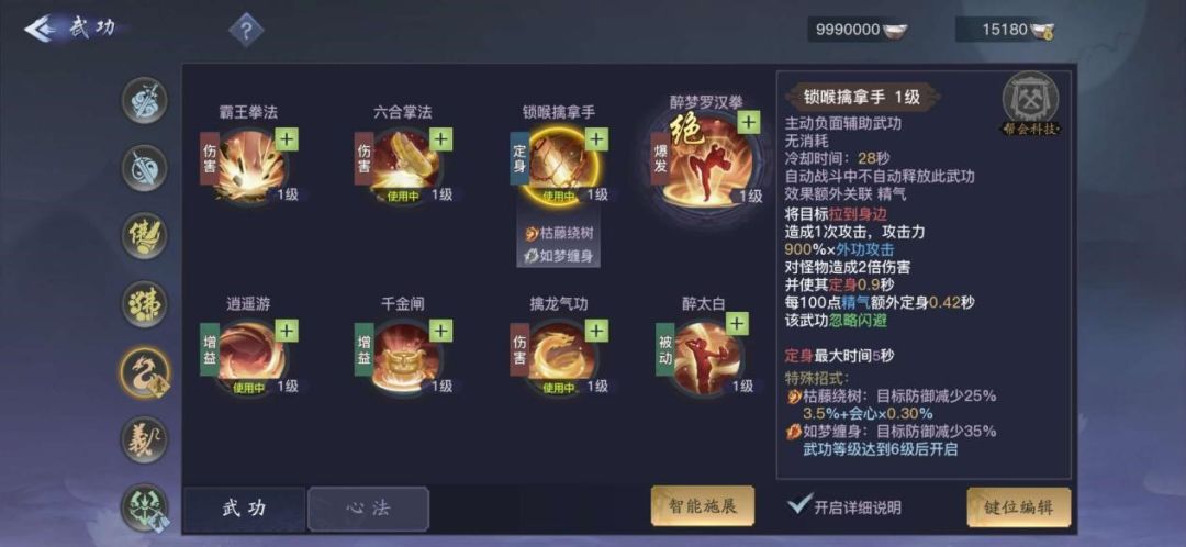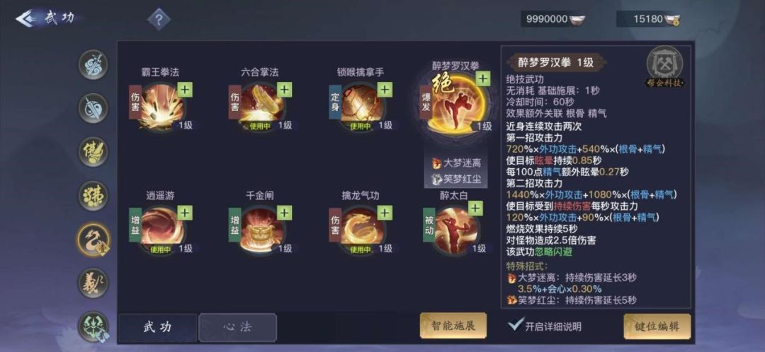 NO2:绝技,醉梦罗汉拳。丐帮的招牌拳法,近身2段攻击。第一招附带眩晕效果,第二招附带燃烧持续伤害效果,第二招攻击更高,特殊招式还会延长燃烧效果时间。精气值可以提高技能附带属性效果,根骨精气双属性提升技能伤害。醉梦罗汉拳不但伤害高,还附带控制效果,可以说是御龙流派的最强攻击技能,加点优先级排在第二位。