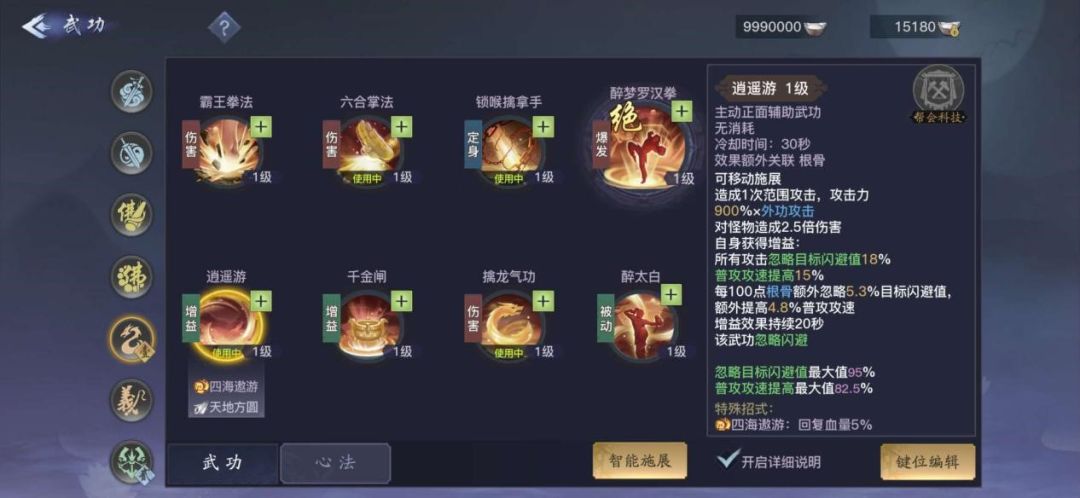 NO3:逍遥游/千金闸,两个技能都是辅助增益效果的BUFF技能,冷却时间短,持续时间长。两个技能效果相辅相成,施展时都可以造成一次群体伤害,逍遥游增加忽视闪避、普攻施展速度提升,特殊招式恢复血量。千金闸增加的后仰时间缩短和回避击退和击倒概率提升,特殊招式是提升内外功防御,加点优先级并列排在第三位。