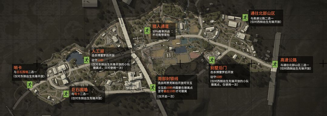 首先是撤离点的变化,常驻撤离点与普通农场封锁区相同,东部出生的先锋在西侧有一个常驻撤离点,西侧出生的先锋在东侧有一个常驻撤离点。地图中部的猎人通道取消了10分钟后开启的限制,但仅有30%的概率开启,同样是不可携带背包。原本需要柯恩币开启的南部封锁线改为需要淘汰阿贾克斯后才能开启,且仅能开启一次。淘汰博雷罗后,出生在东部和西部的先锋则分别可以在别墅后门和人工湖获得一个额外的撤离点,同样只能使用一次。不过博雷罗并非每一局都会出现,需要注意。