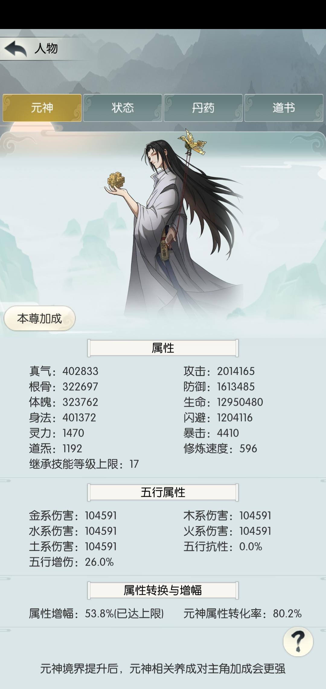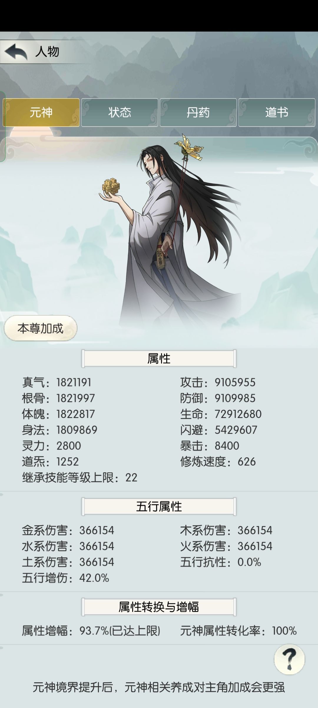 4、元神全部相关模块带来的属性会按照一定比例加成给本尊,这个比例也跟元神的境界有关。