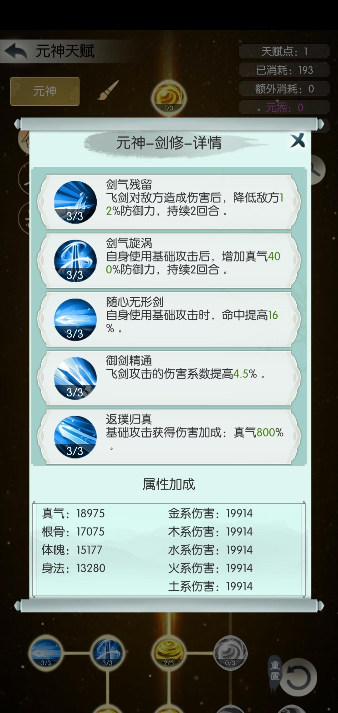 剑如果有玄鱼就带玄鱼。玄鱼前期推塔还是强的。。没有就带枯荣吧。等后面再买一个方圆。。天赋前期可以全部点属性。属性高了。前期推的挺快的。。就比如下图这样