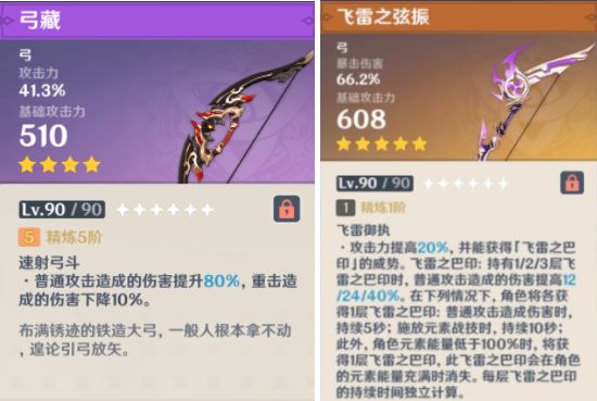 弓藏是四星武器里面公认的神器之一,精5弓藏的被动是普攻造成的伤害提升80%,重击造成的伤害下降10%,并且不需要任何触发条件,非常适配宵宫这类依赖普攻的角色。相比之下精1飞雷满层被动也只有提供40%的普攻伤害加成,并且需要保持能量低于100%才能触发满层,精1飞雷凭借高白值和暴伤的副词条,才能略胜一筹。