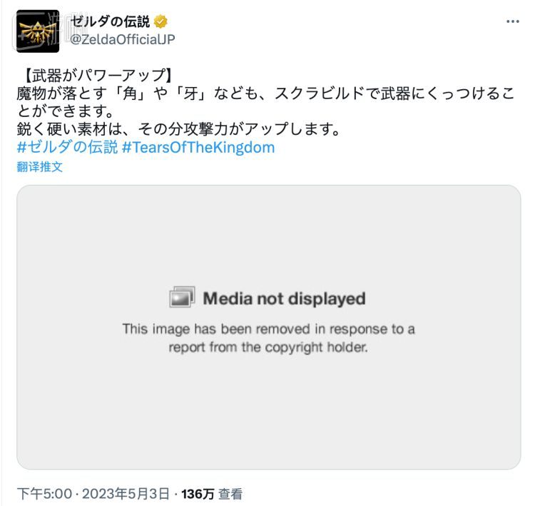 2. 任天堂要求 Twitter 删除涉嫌侵权《塞尔达传说 王国之泪》的图片,可没想到大水冲了龙王庙,《塞尔达传说》官推发布的宣传图片也被认定为侵权而遭到删除。该图片发布于5月3日,目前仍未被恢复。