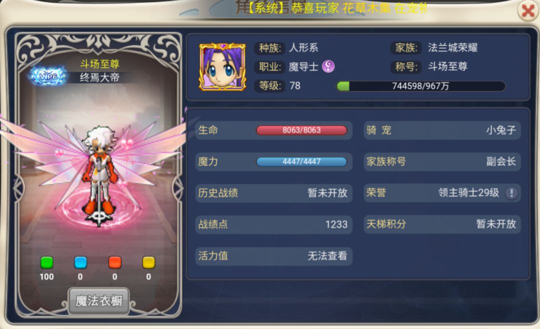 这里也要说一下了,体力影响人物的生命值以及生命回复(提高治疗效果);速度影响敏捷(提高出手速度)与闪躲(概率闪避物理攻击);力量影响物理攻击力;魔法影响精神(提高魔法输出)与魔力(技能释放需要的蓝量);强度影响防御(减少物理伤害)。大家也看到了,这位榜一玩家的加点方式是全魔法+强度,想必部分玩家也注意到了闪躲只能闪避物理攻击,另外就是怪物的命中问题。即便是全点速度的玩家想必在打怪的时候也是出不了几次闪躲的。其余的属性就是通过装备、宝石、坐骑、称号、荣誉等玩法提高。