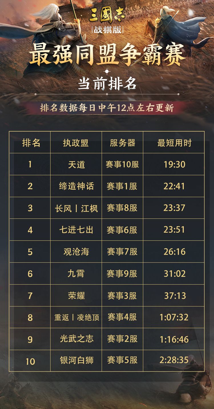 洛阳竞速开启两周,各出线盟均已形成了各自独特的打法思路,管理们仍在通过优化人员分配、指挥调度不断缩短同盟攻打洛阳的时长。最强同盟争霸赛仍在继续,不知道下周的排行榜又会有怎样的变化,阿棋和主公们一样拭目以待!