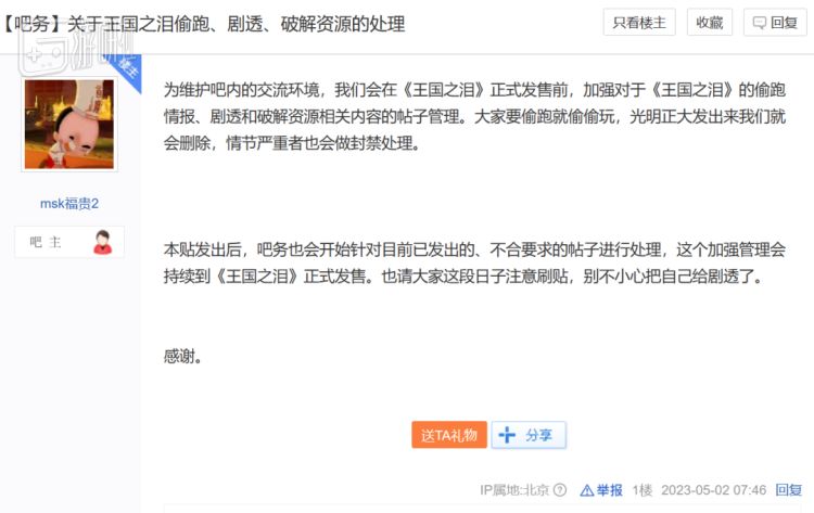 如今在百度“塞尔达传说吧”,吧主将《关于王国之泪偷跑、剧透、破解资源的处理》的帖子挂到了置顶,尽管禁止了用户们在吧内发布相关内容,但吧务团队还是在文中表达了一些态度“大家要偷跑就偷偷玩”。