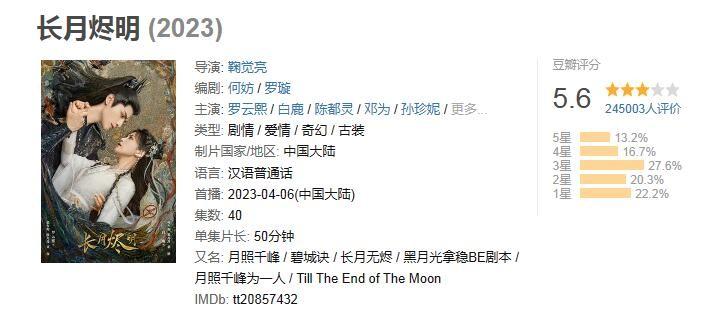 《长月烬明》是由鞠觉亮执导,罗云熙、白鹿、领衔主演,陈都灵,邓为、孙珍妮等主演,王一菲、肖顺尧特别出演,陈博豪友情出演的奇幻仙侠剧。该剧已于2023年4月6日在优酷播出,目前《长月烬明》的豆瓣评分为5.6分。