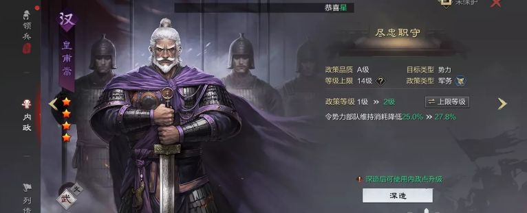 皇甫嵩和卞夫人的内政效果是一模一样,不同的是皇甫容易升到14级,卞夫人最高可以升到15级,最高的效果是部队维持消耗降低63.9%。