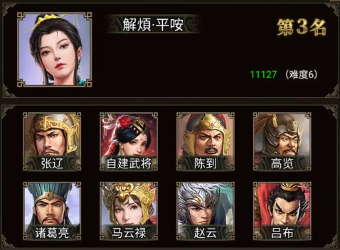 张辽、陈到、高览、诸葛亮、马云禄、赵云、吕布和一位自建武将