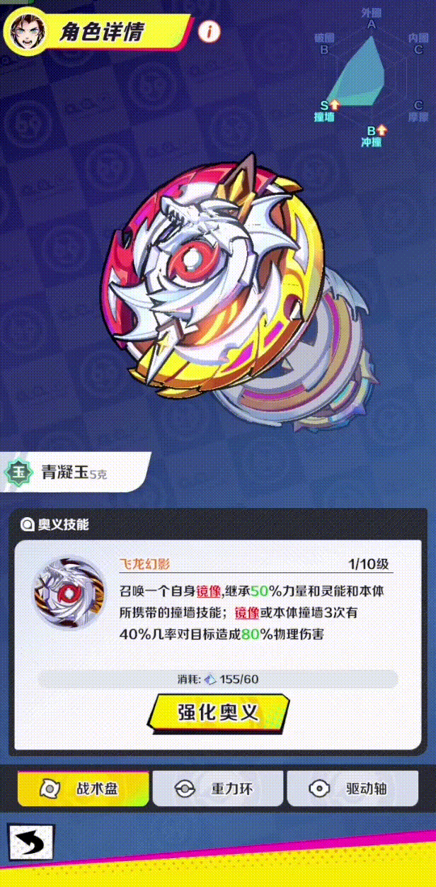 组成一颗陀螺,需要三个部件:战术盘,重力环,驱动轴,影响着陀螺的转速、运动适性和伤害类型。本次将上线172个战术盘,116个重力环和56个驱动轴,陀螺手可根据盖环轴的材质属性进行自由组装搭配,打造专属陀螺。如何组装一颗完美的陀螺克敌制胜,就需要陀螺手的策略思考和实践积累。