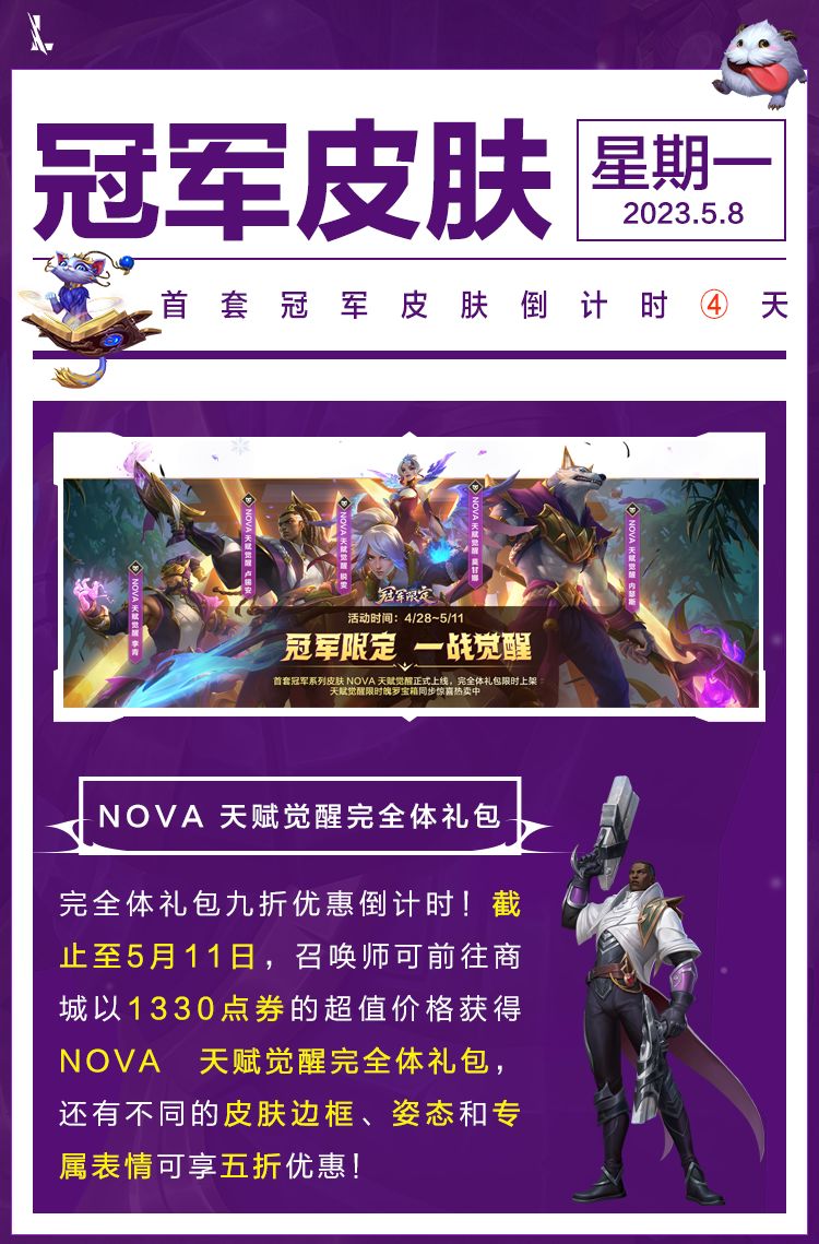 NOVA 天赋觉醒冠军皮肤仅剩最后4天啦!召唤师只需1330点券的超值价格,即可获得NOVA 天赋觉醒完全体礼包,还有不同的皮肤边框、姿态和专属表情可享五折优惠!