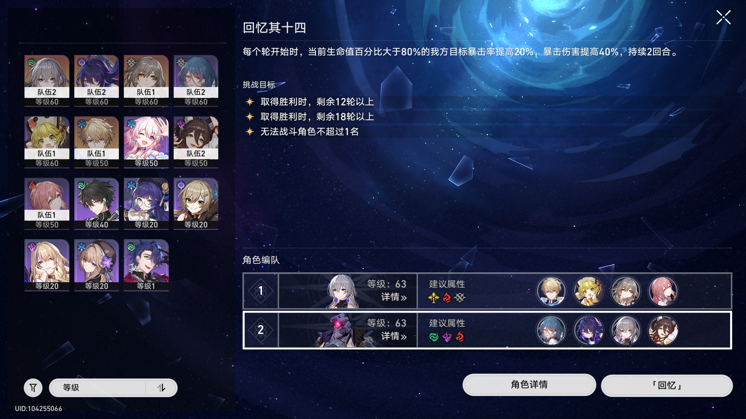 练度方面,上场的8人除奶妈血量都在2000左右,娜塔莎血量3000,杰哥防御有2000,物主1800攻击力 40暴击 60爆伤、虎克1600攻击 30暴击 60爆伤,希儿2200攻击 60暴击 70爆伤(没办法我这号量子套是真的很难出货)。